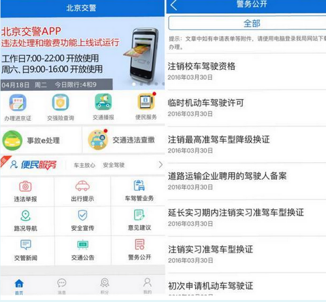 这是北京公安局推出的“北京交警”APP截图,用户可在首页方便查询业务办理情况以及警务公开信息。各地公安机关依托互联网公安门户网站、政务微博、微信公众号、手机APP客户端等平台,建立网上公安局,提供实时便捷的执法信息查询。 ——北京推出立案公开查询二维码和短信服务,在受案回执上增加二维条码,方便群众通过移动端查询,并可以进行满意度评价和留言;同时,通过政务短信服务系统,自动向报案人推送案件进展提示短信; ——河南建设应用“互联网+”便民服务平台,包括治安、户政、科技、消防、出入境、交警等6个办事大厅,能够提供220项在线服务业务。