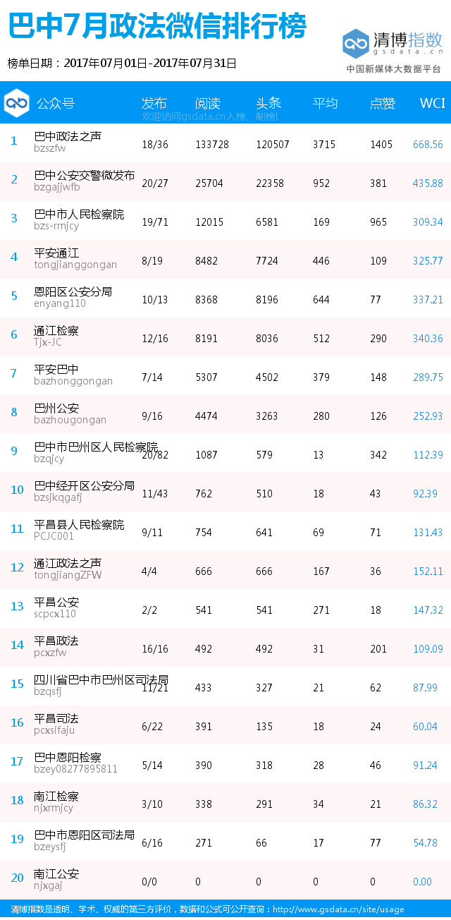 为进一步推进我市新媒体矩阵建设,推动各家政法单位规划提升新媒体运营水平,四川法制报新媒体中心将持续为大家推出巴中市政法系统微信排行榜榜单(数据来源清博指数),囊括了巴中市级法院、巴中市级检察院、巴中市级公安、巴中市级司法局的各家微信公众号,以月为单位推出榜单,以便各家政法单位了解微信数据、调整运营策略、进行长远规划。