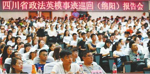 参与全省政法英模巡回报告团的20名政法英模,包括9个集体、11名个人,是近5年来全省政法系统涌现出的英雄模范代表。9月11日至9月22日,同样的场景在绵阳、乐山、泸州等10个市(州)、10所高校内反复出现。