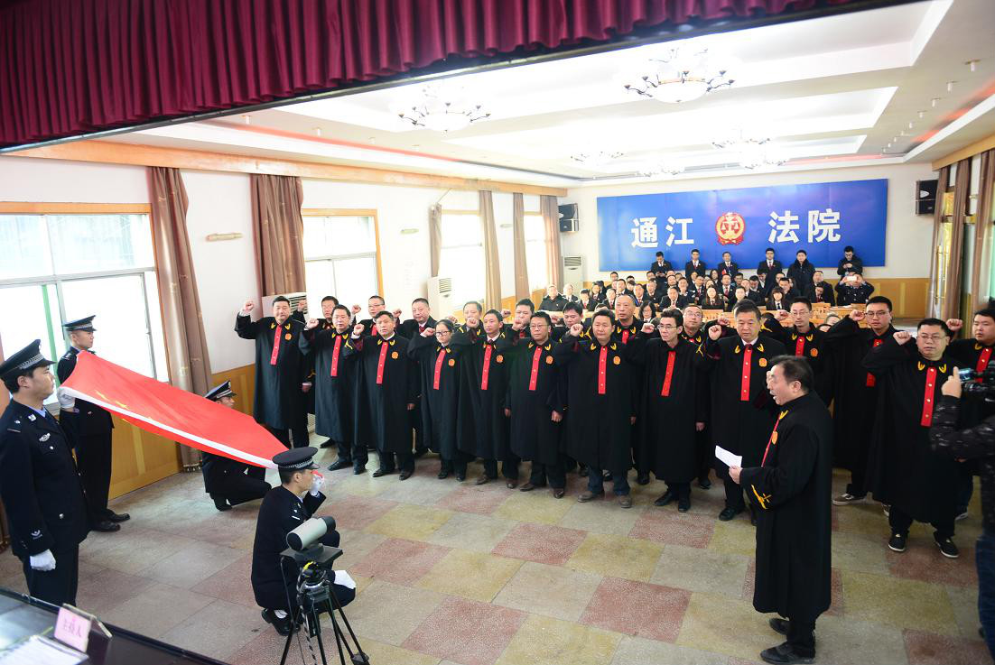 举行宪法宣誓。通江法院的员额法官们,面向国旗,举起右手,铿锵有力地庄严宣誓: